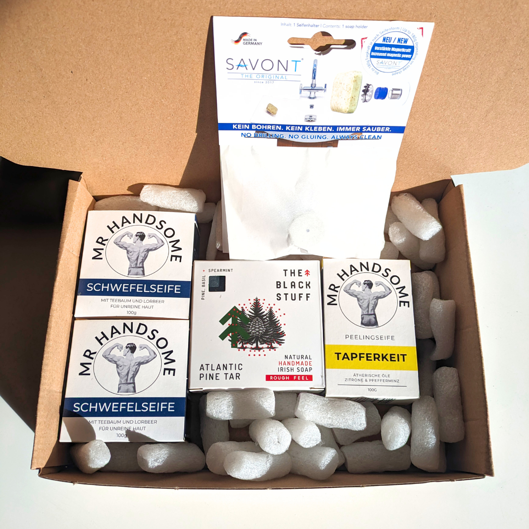 ✔ Pflegeroutine für Männer mit Pickeln und Akne am Rücken bestehend aus 2x Schwefelseife, 1x Peelingseife, 1x Schwarze Detox-Seife und 1x Seifenhalter (Neupreis: 8€)