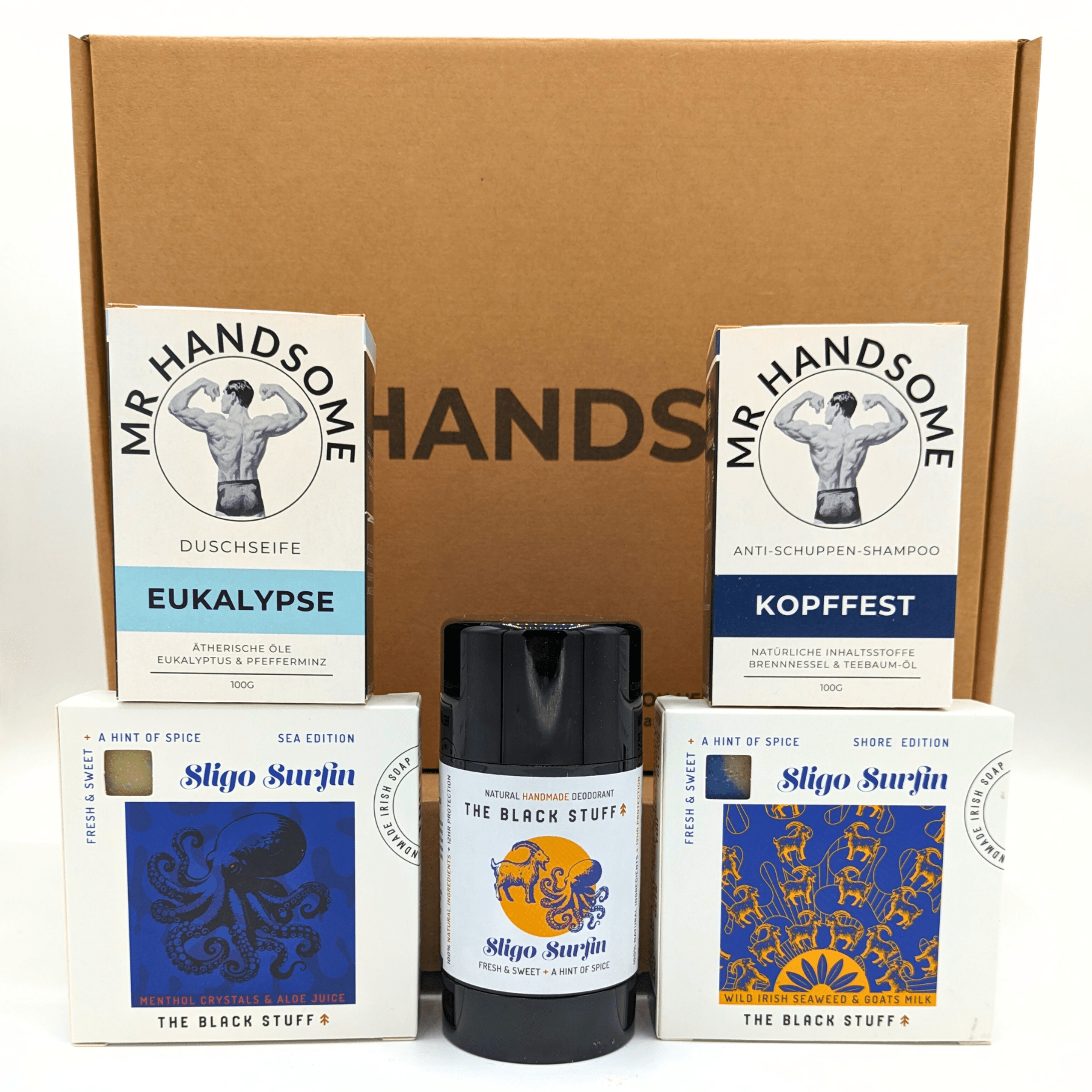 Alle Produkte in den Geschenksets werden in unserem Mr Handsome Seidenpapier verpackt und in einer Mr Handsome Box geliefert. Bei Geschenksets mit eigener Kartonage wird das gesamte Set in unser Seidenpapier verpackt und ebenfalls in unserer Mr Handsome Box geliefert.